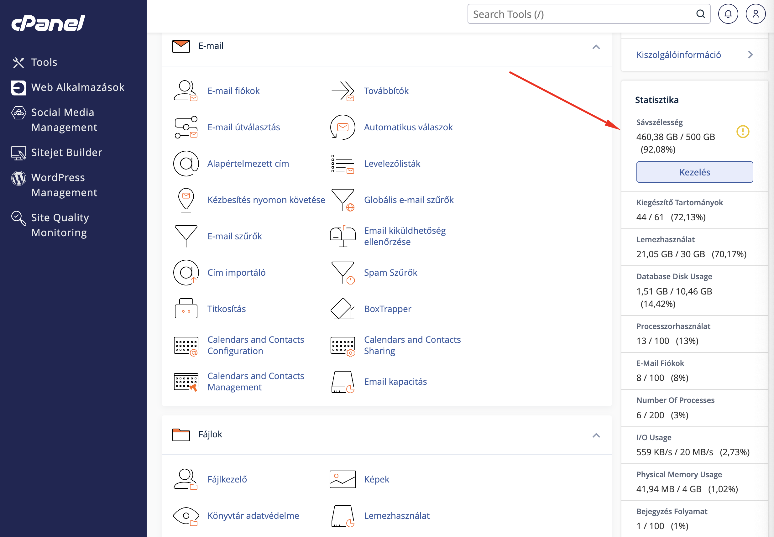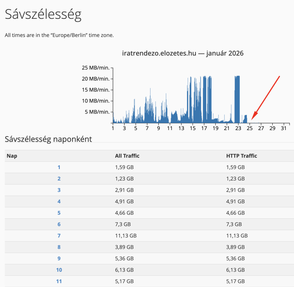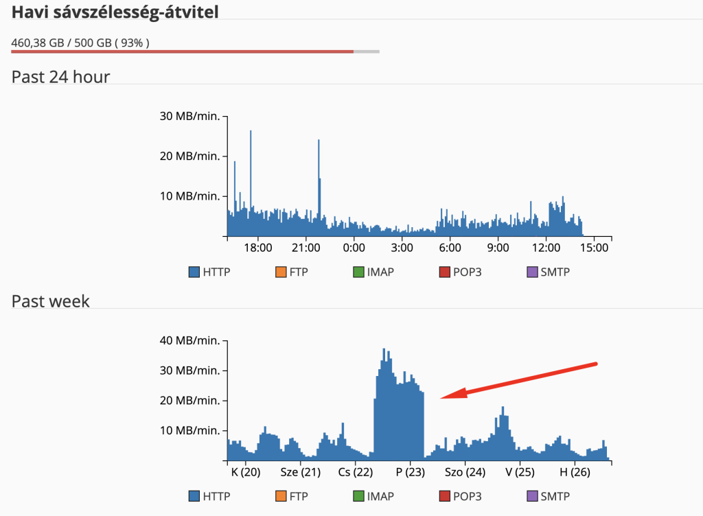 Az én esetemben most az látszik, hogy van egy havi 500 GB sávszélesség limit amit most 26-án eléggé megközelítettem, és volt már olyan, hogy elértem. Ez azért nagy probléma, mert ha eléred a tárhelyeden lévő összes oldal le fog állni a fenti hibaüzenettel. És ezt a legtöbb esetben csak az ügyfélszolgálaton keresztül könyörögheted ki, hogy emeljék meg arra a pár napra. És ez egy támadás miatt van, ahol valószínűleg be is lassították az oldalakat, mert maximumon volt a sávszélessé, ezt a Sévszélesség menüpontban ellenőrizhetjük: