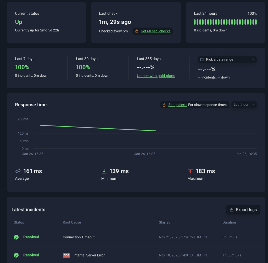 A weboldalunk online figyelésére a legjobb megoldás az uptimerobot.com, és itt bőven elegendő az ingyenes csomag ha folyamatosan figyeljük az emailjeinket, ha nem akkor pedig a fizetős szolgáltatásban sms-értesítést is kérhetünk. Az ingyenes csomag 5 percenként megnézi a weboldalunkat, hogy működik-e és ha a válasz 200-as kód akkor minden oké, de ha például 508-as hiba kódot kap vissza, vagy be se jön az oldal akkor küld egy emailt. Egy statisztikán folyamatosan nézhetjük, hogy mikor állt le az oldalunk és mennyi ideig állt.